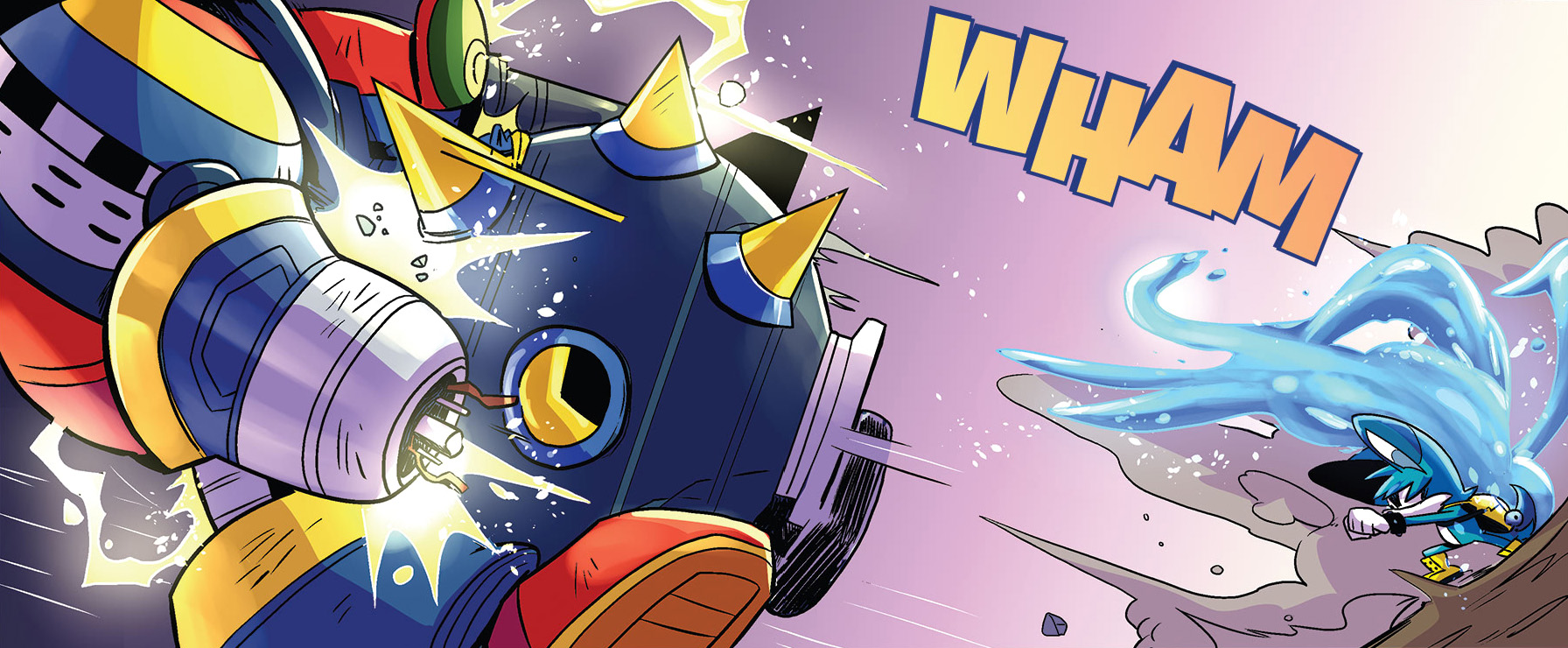 Surge delivers a devastating Spin Attack at the Egg Breaker's face.