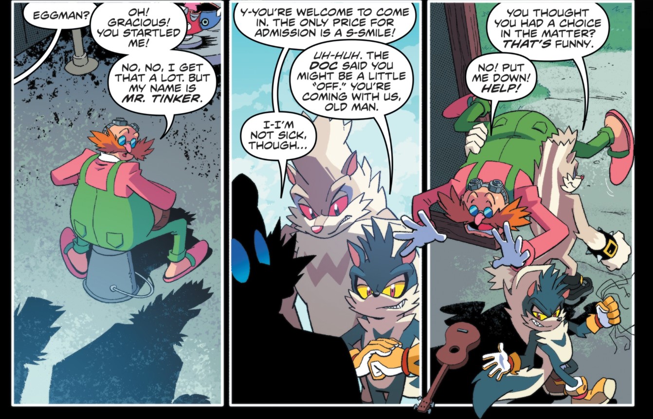 Elsewhere, "Mr. Tinker" (the amnesiac version of Eggman) is singing a song while playing a guitar as children are enjoying themselves at his "Eggman Land" theme park. He is soon visited by Rough and Tumble, who swiftly kidnap him but not before Rough mentions that the "doc" said that Eggman might be "a little off".