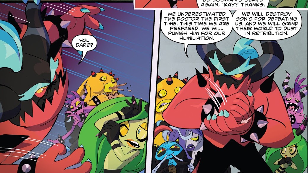 Meanwhile, on the Lost Hex, Zavok talks to the rest of the Deadly Six about recent developments - the other Zeti seem to be barely listening, save for Master Zik. Zavok explains how they have been invited to Dr. Eggman's base by his newest lackey to help fix the crisis on the world below; he states that they will accept his hospitality and make him pay for it. Zeena points out that this could be another trap, not looking forward to being enslaved once again. Zavok furiously intimidates her into silence, also spooking Zazz and Zomon. The Deadly Six leader states that they underestimated Eggman previously; now that they are well-prepared, the Deadly Six will punish Eggman for their humiliation, destroy Sonic for defeating them, and then destroy their world below as revenge against them both.