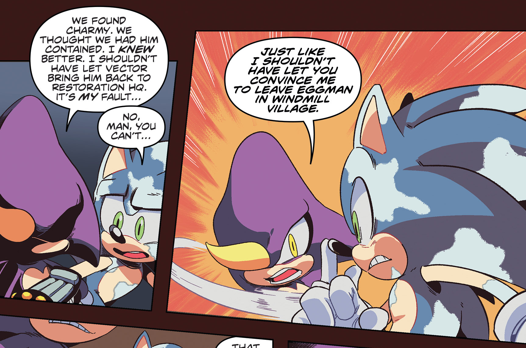 - Espio recalls wanting Dr. Eggman to be brought to justice while Sonic wanted "Mr. Tinker" to have a second chance in Windmill Village, which occurred in Sonic the Hedgehog #5, "The Fate of Dr. Eggman, Part 1".