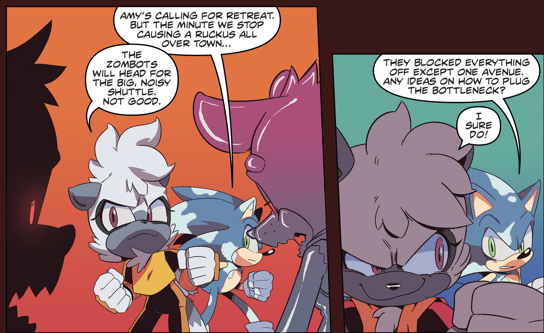 Using a group of Zombots to bounce over a gate, Sonic runs to meet Amy and the other Restoration members at the shuttle. She tells him that Espio, Tangle and Whisper were keeping the Zombots distracted while Tails and Cream found survivors; the rest of the Restoration has made a choke point that will allow Amy and Gemerl to handle any Zombots that do find them. They are nearly done with evacuation, but Amy notes that once they pull back for retreat, the Zombots will swarm them. Sonic takes this as his cue to cover the escape, planning to rendezvous with Tangle to see if she has any ideas on how to do so. Before Sonic heads off, Tails and Cream come by, though the hedgehog receives cold reception from the latter. Amy quietly explains that Vanilla had held back some Zombots in Restoration HQ so that they could escape and Cream had seen the entire thing. Tails asks Sonic if he had the data recorder with him, only for the hedgehog to reveal that he had lost it after running into Eggman. After a brief moment of silence, a tearful Tails states that he would not have been able to do anything anyway without a lab; regaining some composure, he tells Amy that they could not find any other survivors. Realizing that they've saved everyone they can, Amy turns to her teammates, telling them that it was time to retreat; Sonic plans to go find Tangle while Tails says that he will find Espio and Whisper. As the two head off, Gemerl approaches Amy and tells her that he performed a scan on Sonic; according to him, the hedgehog is exhibiting a level of infection higher than previous estimates should allow. Amy wearily asks for a simpler explanation, which Gemerl readily provides: Sonic's speed is losing its ability to stop the Metal Virus and that sooner or later Sonic has limited time before he succumbs to his infection, becoming a Zombot.