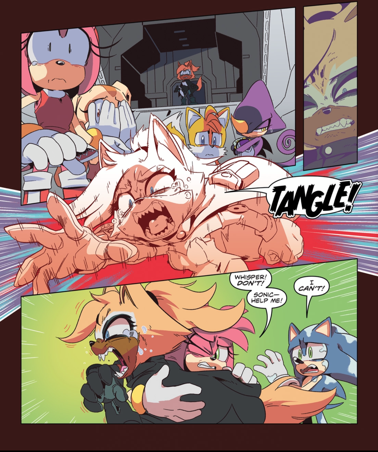 As the shuttle flies over Tangle's head, she quietly asks the Restoration not to keep her waiting too long before continuing to fight the Zombot horde. She momentarily jumps as the infection reaches the base of her tail, calling the feeling “unpleasant”, but she refuses to give up. Desperately saying that she can still fight, she delivers a final punch that freezes just before contact; the transformation is finally complete. The new Zombot begins to walk alongside the others as Sonic solemnly looks back at the village; inside the shuttle, Whisper bawls into Cream's lap as the Wisps try and comfort her.