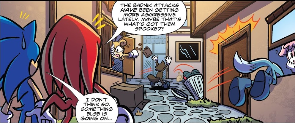 - Sonic goes to check up on Knuckles, as per Amy's request back in Sonic the Hedgehog #2, "Fallout, Part 2".
