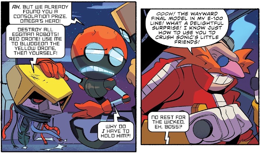 Orbot presents Omega's head to Eggman, who forms a plan for the robot.