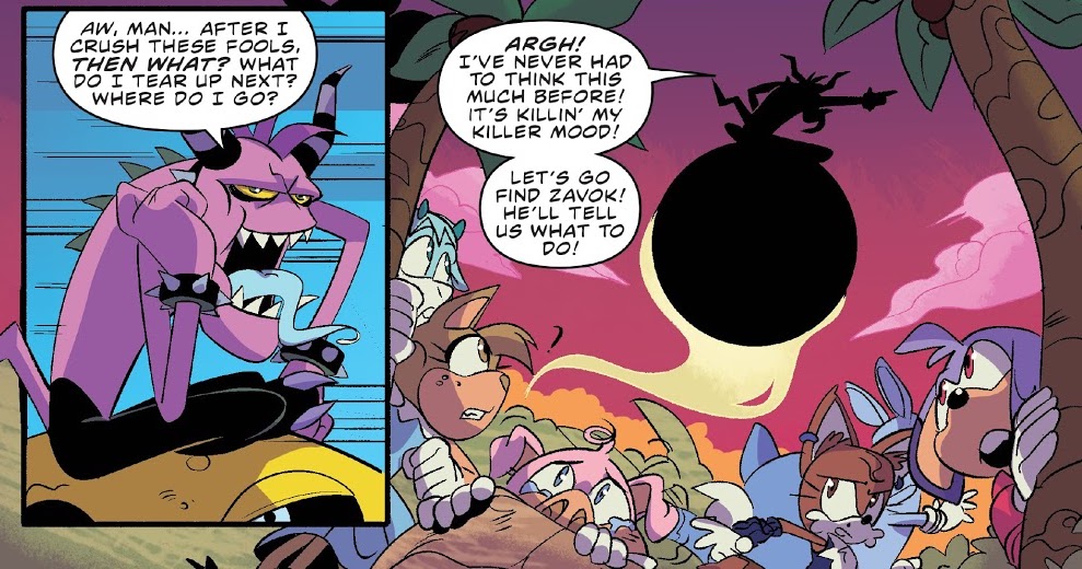 As Knuckles continues to angrily wait for Sonic, Amy falls to her knees, relieved that the crisis is over. Unfortunately, Tails tries to call her attention to another situation. Amy tiredly pleads with the fox cub, stating that they just prevented the end of the world and Sonic may be lost to them, and says that she does not know how much more she can take. Tails agrees but nonetheless explains that Zavok was just one of the six Deadly Six members, meaning there were still five others out there. In Riverside, Zazz chases after civilians on his Moon Mech. He quickly becomes bored when he realizes that he does not know what to tear up after crushing the innocents or where to go. Frustrated with having to think so much, Zazz decides to leave the town to find Zavok and receive new orders. In Sunset City, Zeena scares off the civilians. She is now angered by the fact that they no longer listened to her and that she had to do her own fighting as well. Thinking that Zavok's plan failed, Zeena decides to leave but as she takes off, she tells the citizens of Sunset City that they will all suffer for her indignity.