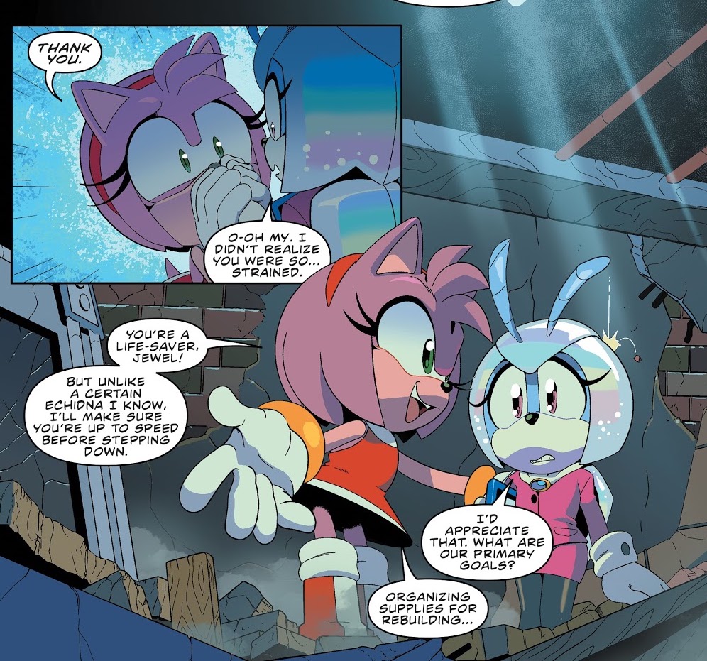 Back on Earth, Amy finds herself unable to deal with a large amount of paperwork in an even more worn down Restoration HQ. She says that she is no leader and she helped administrate the Resistance because everyone needed to pitch in. She only became leader of the Restoration because no one else was there and work had to be done. The young hedgehog thinks for herself, wishing that she could go back to the days of when it was just her and Sonic racing around from one adventure to the next. Solemnly recalling Sonic's disappearance, Amy says that he gave everything to save everyone from the Metal Virus and since he never gave up, she should not either. Just as the hedgehog wishes that she had some help, Jewel enters the room looking for her. The two introduce each other and Jewel tells Amy why she came by; she had heard from Tangle how Amy was not enjoying the rigors of her work, even before the plague. The beetle explains how she likes to catalogue and organize and notes how excited she feels by looking around the room and bringing it to order. With this, Jewel offers to take over administration of the Restoration and give Amy a break. Amy is taken aback with the kindness and simply says to Jewel "Thank you." Jewel is slightly startled by this and notes that she did not think that Amy was so strained. Calling Jewel a life-saver, Amy decides to bring her up to speed on the current Restoration affairs before stepping down, with the primary goals being to organize supplies for rebuilding and find people displaced by their time as Zombots.