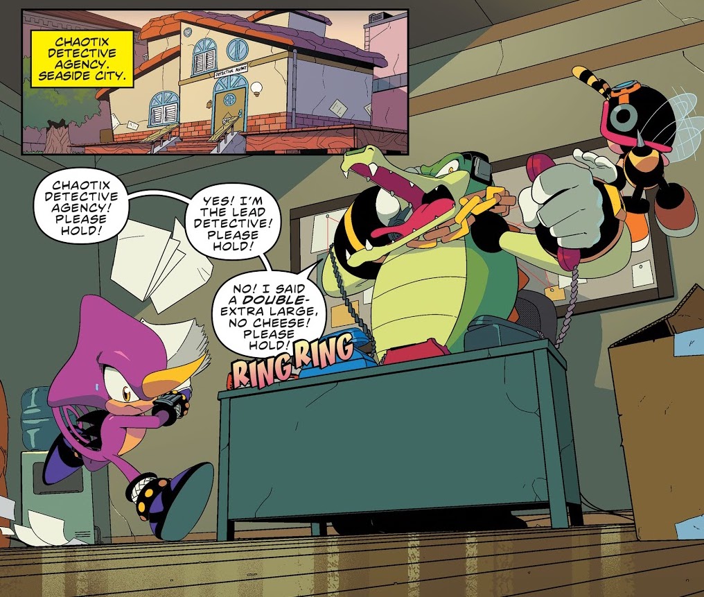 - On page fourteen, Vector says "I-It's all part of being a good detective, ma'am." He also says this same quote at the end of Team Chaotix's storyline in Sonic Heroes.