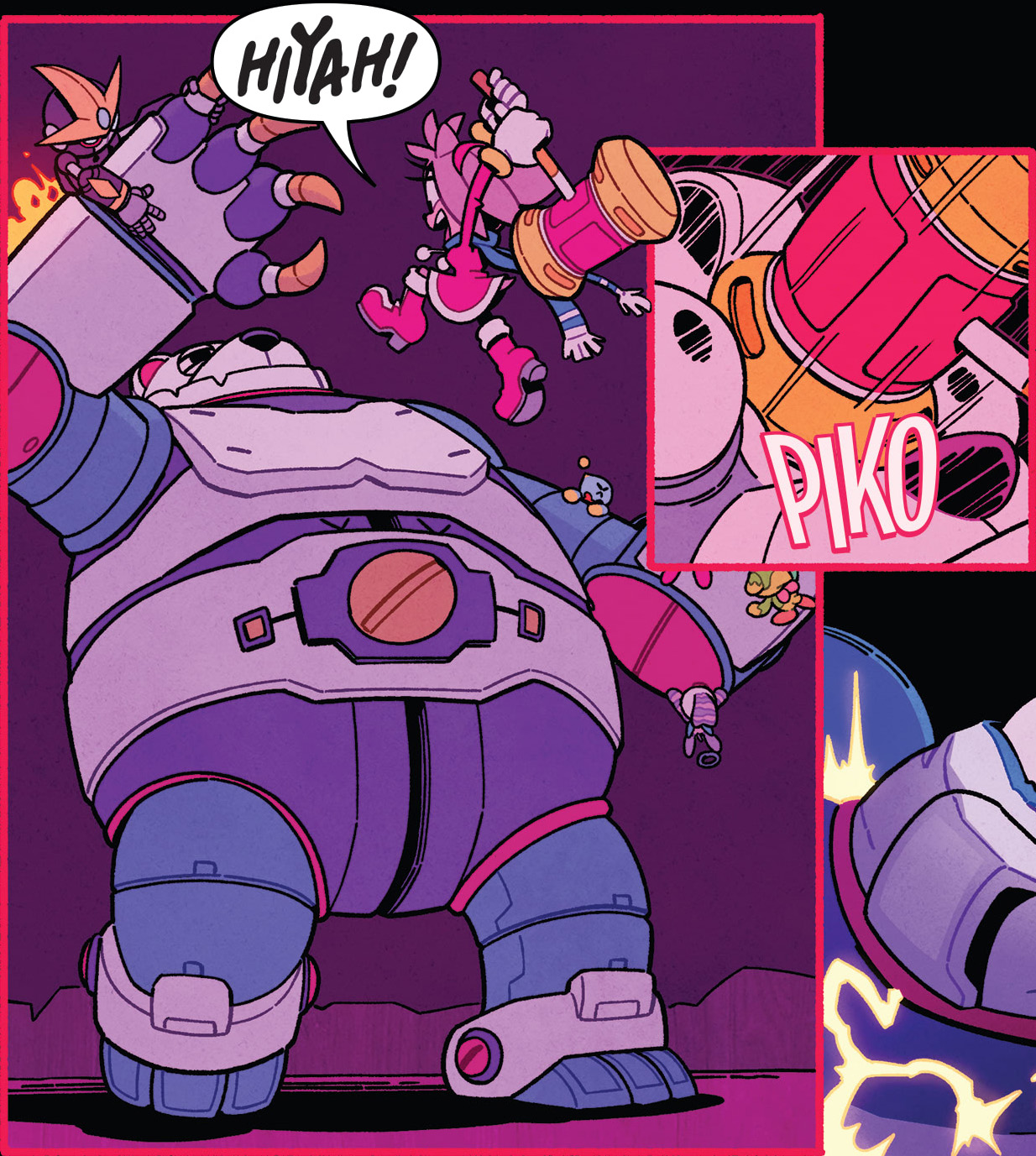 The young rabbit tells him that he did not have to be perfect because she would be there to help, and they will both do their best to protect each other. Hearing this, Gemerl thanks Cream. Amy wishes to take a breather from fighting the Snowy, only for several Chao to step in and hold the Badnik back. Gemerl flies in and holds down one of the Snowy's arms, allowing Amy to jump into the air and smash its processing core in its head with her hammer. With the threat neutralized, Amy says that she had not done that much cardio in a while, due to her being stuck behind a desk. Cream congratulates all the Chao for their work. Suddenly, Rouge and Tails burst through the roof to tell everyone to evacuate; Tails adds that they should bring along the E-100 Series parts.