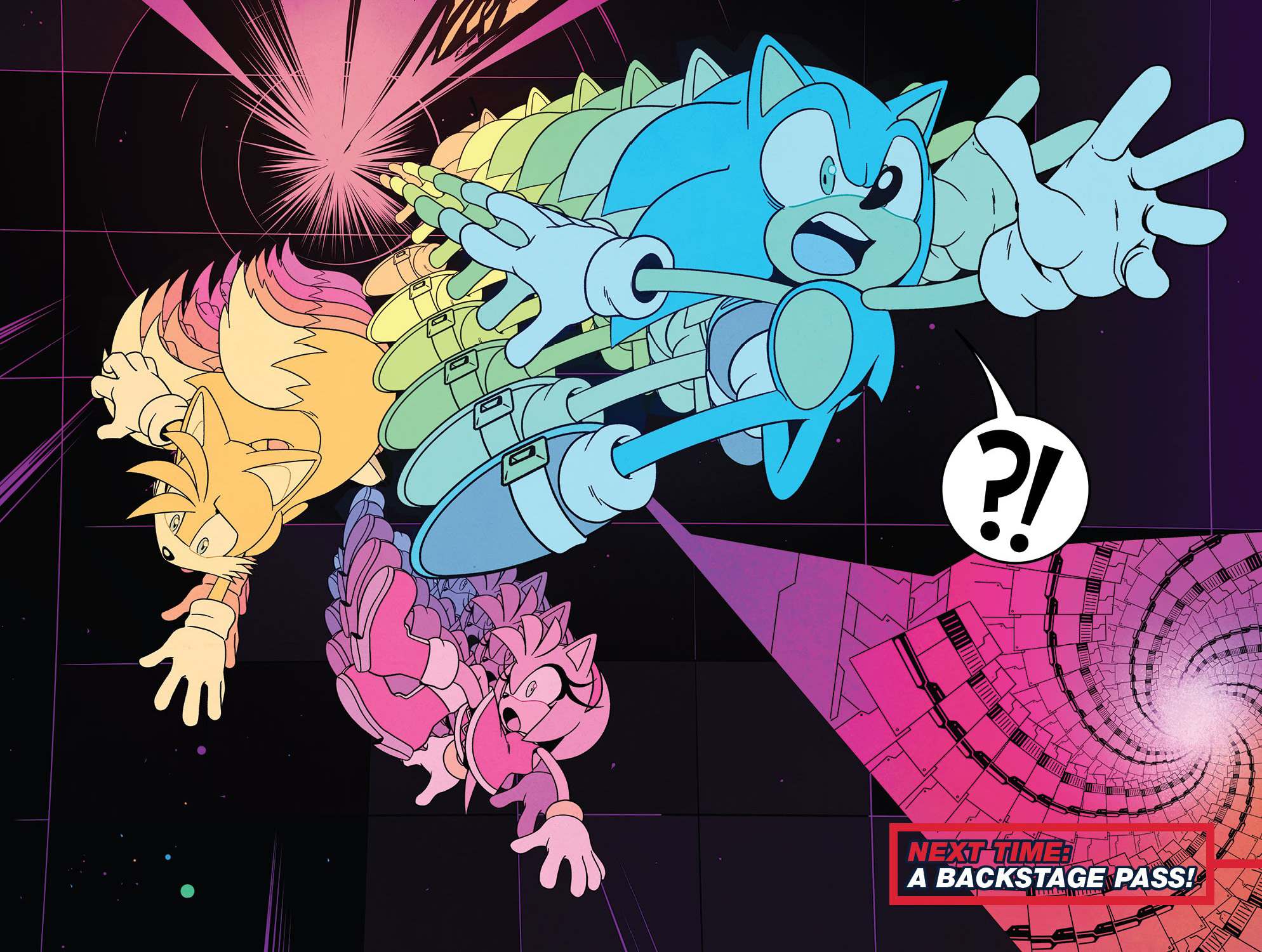 He grabs both Tails and Amy's hands and rushes down the hallways. As he does so, the trio find themselves running through a spectrum of colored hallways. Not only are they in different directions, but the three of them find themselves mirrored. Unsure of where to go next, Amy just tells Sonic to go faster; Sonic asks if she is sure, to which she says no but feels that if they could out-pace the maze, they could break it. Sonic complies and travels even faster. Amy throws her hammer at a wall and Sonic kicks it into it to break the maze. However, the trio suddenly fall into an unknown space.