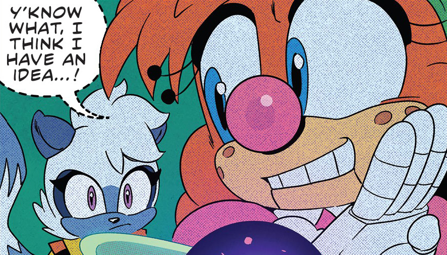 - Belle appears on page five accompanying Sonic, Tails, Amy, and Jewel on their tour of the HQ, despite just leaving to go to the machine shop.