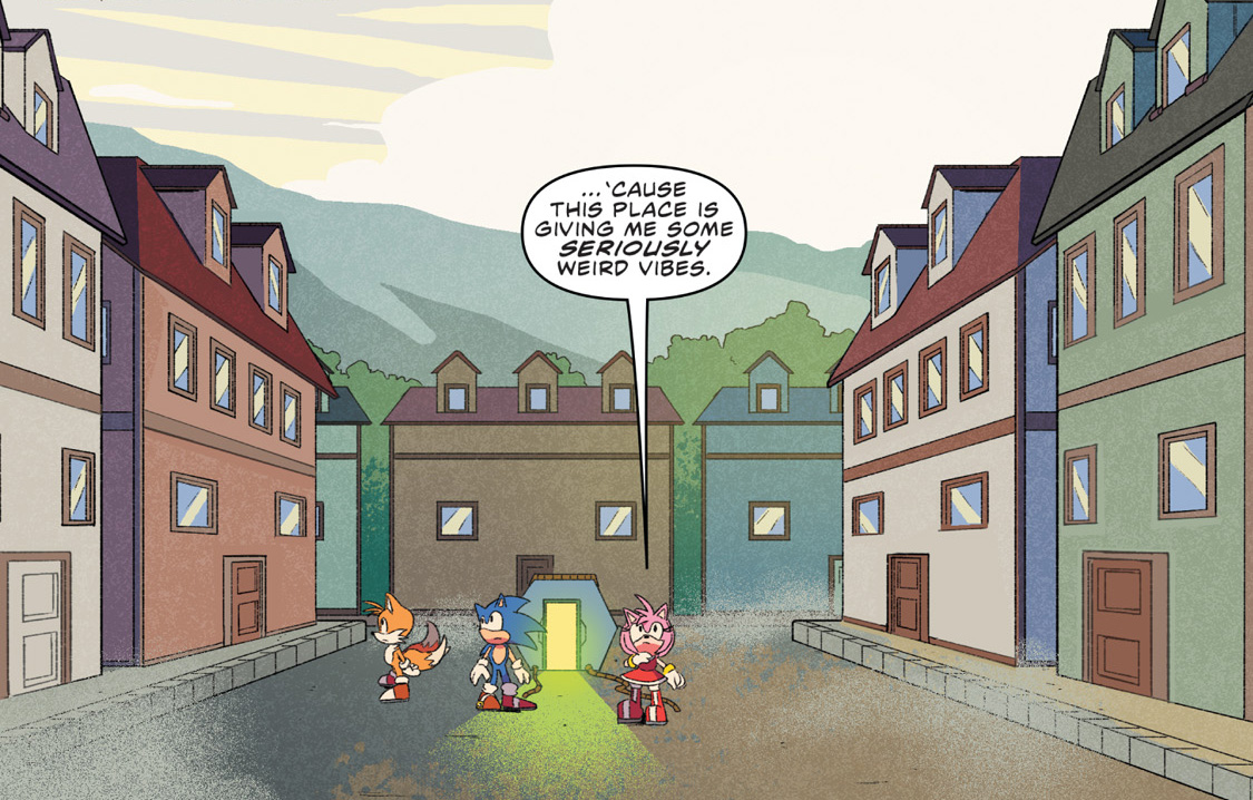 Sonic, Tails, and Amy in a weird town-like area.