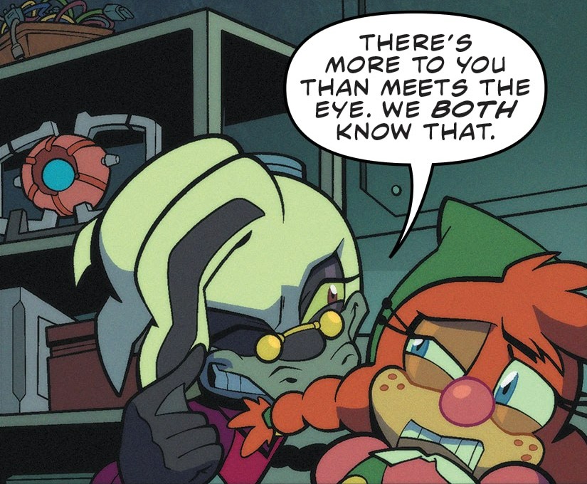 Tails calls Jewel on his Miles Electric to fill her in on the situation before asking for an update on the Chaotix. She tells him that they missed their last check-in, possibly meaning they are busy or something bad has happened. Sonic tries to allay her fears, believing that if anyone can find Belle, it is them. Nonetheless, he decides he should join the search as well. Tails warns him to be careful; despite the Deadly Six being gone, Eggman is still around to cause trouble and they have no idea what Dr. Starline is planning. Elsewhere, Belle wakes up to find herself strapped to a table in a private lab while Starline examines the inside of her head. Glad that she is awake, he tells her that she has the most obtuse start-up routine but notes that he did seek her out for her unorthodox design, Belle is confused by this as she does not believe she is special, which Starline disagrees with and believes that Belle disagrees with as well. He assures her that he will not disassemble her as he thought of her to be an incredibly complex piece of art. Despite his falling out with Eggman, he still holds his work in high esteem. Belle angrily protests that she was not built by Eggman. Starline says that this is true to an extent but adds that she did not know the full story. Starline explains that Eggman lost his memories following one of his most critical defeats. He was taken in by the people of Windmill Village and took on a new persona of "Mr. Tinker". Starline took him in and went to great lengths to return Eggman to his former state of mind, and succeeded with help from Metal Sonic. As Belle realizes Starline was the one behind Eggman's return, Starline explains that the only drawback was the loss of Mr. Tinker's alternate design perspective. According to him, Eggman has a certain style to his creations; sometimes minimalist, sometimes eclectic, but always with a central motif. He never would have thought of making a puppet like Belle and will never do something like that again. Due to this, Starline needed to study her. Before he can finish, Belle has an outburst, angrily yelling at Starline for taking her father away from her.