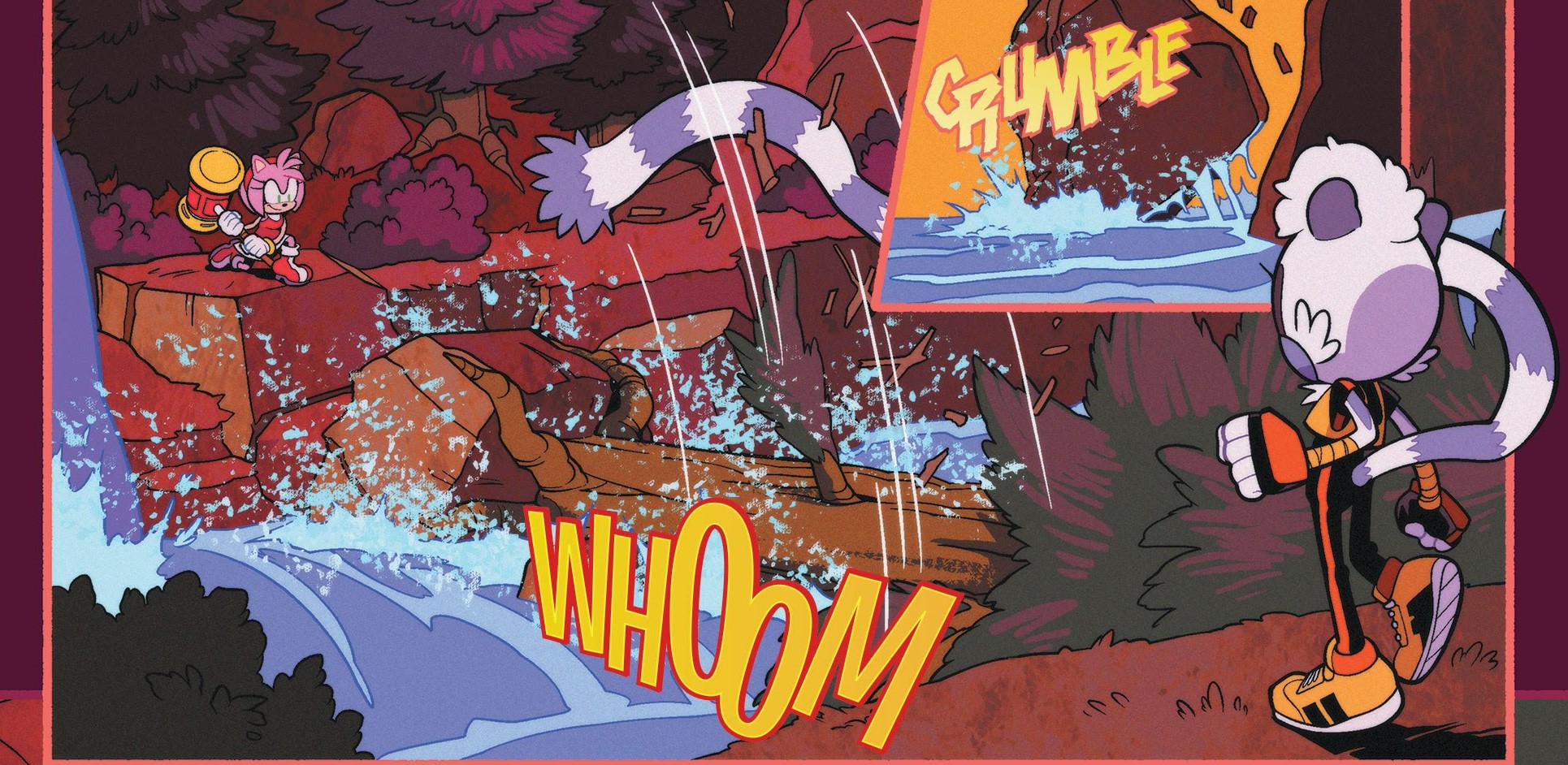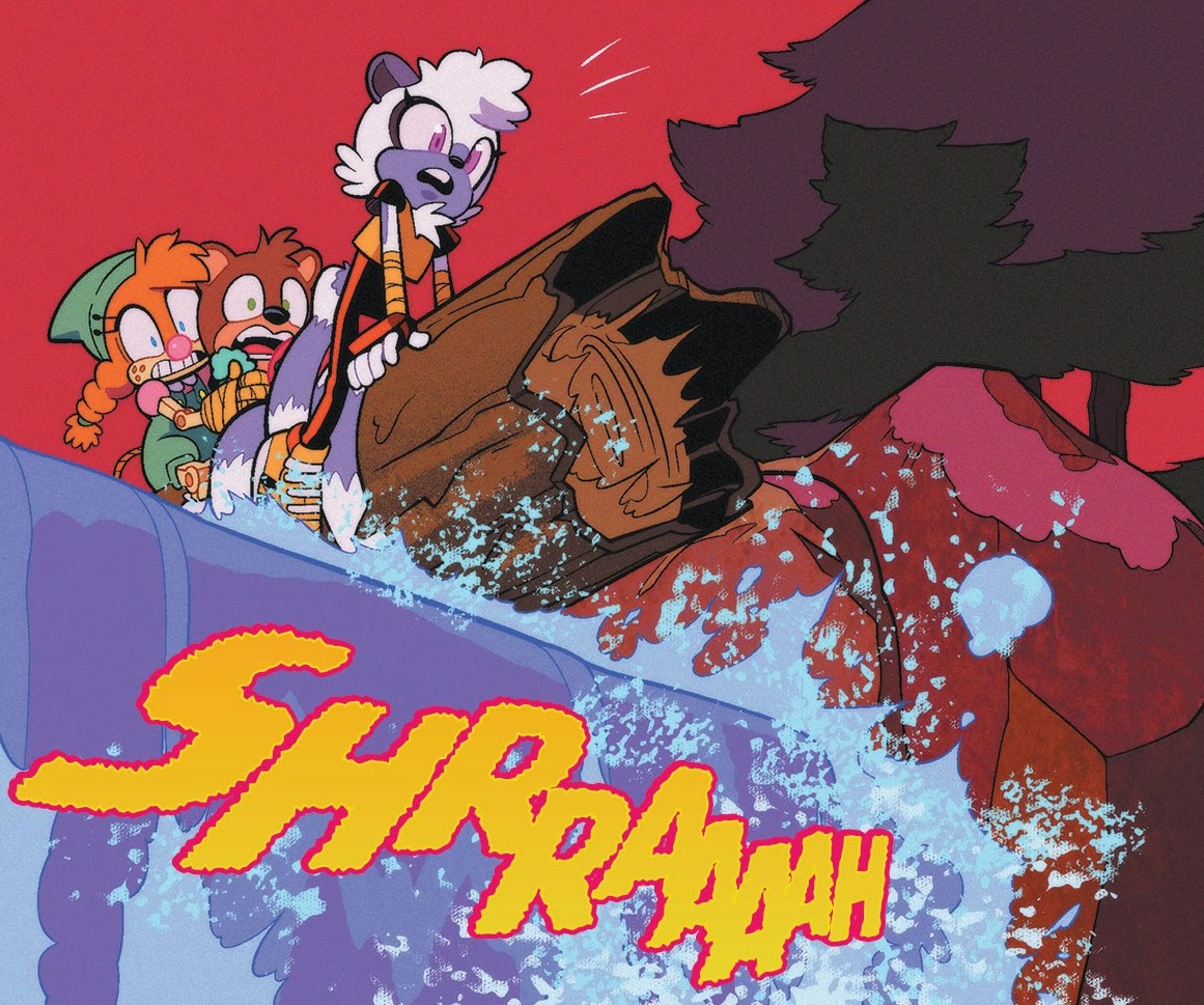 - Tangle, Belle, Ashe, Red Hot, and the defective Motobug have fallen into the river following the events of the previous issue.