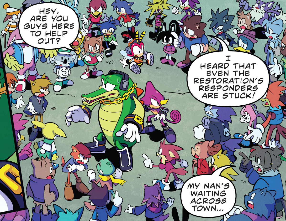 - The aftermath of the chaos that Surge and Kit caused Central City in Sonic the Hedgehog: Imposter Syndrome #1 is brought up in this issue.