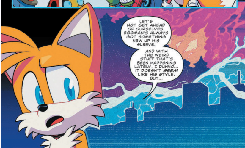 - Tails alludes to the fire at the Forest Ridge Zone Campground that happened in Sonic the Hedgehog #45-#47, and the blackout in Central City that was caused in Sonic the Hedgehog: Imposter Syndrome #1.