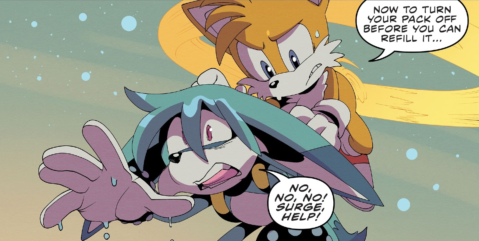Tails attempts to turn off Kit's Hydro Pack.
