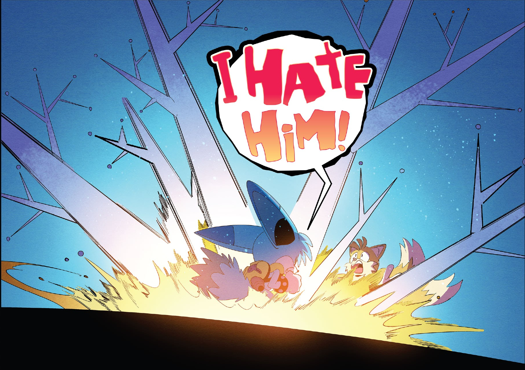 Kit refuses, stating that he does not need friends, leaving Tails to ask if they could work through it with competitive rivalry. Kit does not answer as he does not want to decide anything without Surge. Seeing that he is vulnerable but volatile, Tails decides to handle the situation carefully. The fox cub claims that his throat is getting sore from yelling and asks if he could join Kit; he states that he wants to call a truce until all the facts are sorted out. Kit accepts this, allowing Tails to fly over to him. The fox cub first asks about the Badniks, to which Kit answers that Dr. Starline summoned them for his own army. Tails explains to the fennec that he tried to kidnap him but did not know why. Assuming that it was for something awful, he asks if he hurt Kit. The fennec replies that he did repeatedly, erasing his memories and forcing him to be happy when it happened. He screams that he hates him, solidifying the water around him into large spires. Tails says that he wants to stop the doctor and asks if they could do that together. Intrigued by the offer, Kit asks what would happen after, to which the fox cub says that they should take things one step at a time as the most important part was stopping Starline's plans. When Tails prepares to find Sonic, however, Kit erupts and states that Surge has to destroy Sonic as it was all she wanted, leaving Kit to prevent Tails from intercepting.