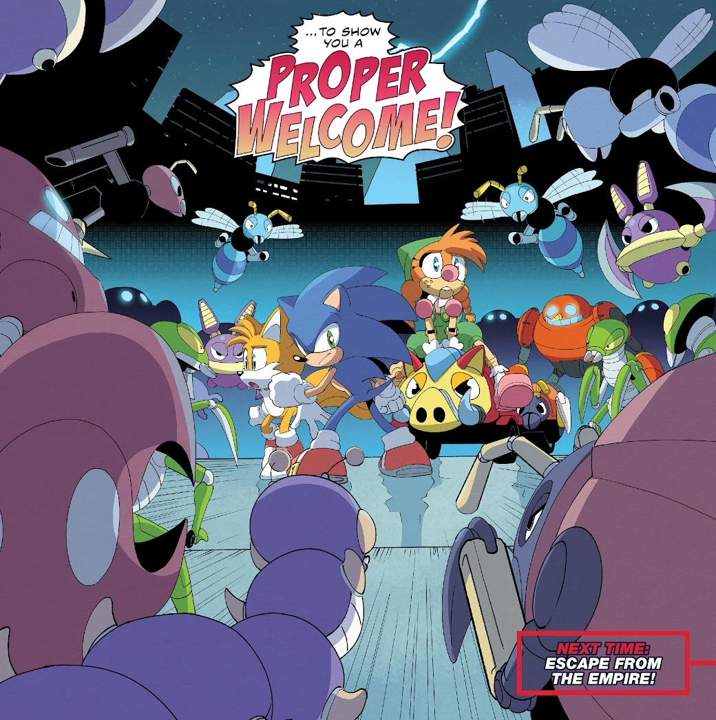 - Sonic, Tails, and Belle make it to Eggperial City, after journeying there following the previous issue.