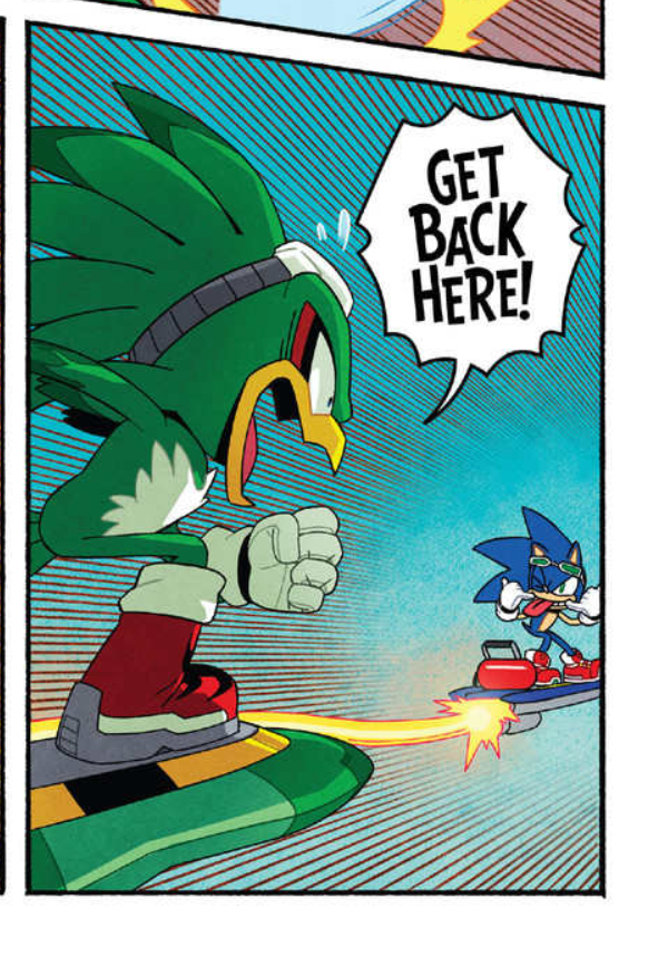 Back at the race, Nite announces how the racers are heading into the town, where the Babylon Rogues catch up to Sonic's team and Jet begins to mock the hedgehog, taunting him with their busy recent work and cockily questions the speedster if he thinks he can truly beat the Babylon Rogues. Wave then teases Tails over his extreme gear, but Amy quickly defends him, telling Wave she would choose Tails' gear over hers any day. Storm attempts to threaten Amy, but the attempt quickly fails as Amy strikes fear into the albatross. Jet goads Sonic into making his own taunt, but the hedgehog ignores him and sets his acceleration to the max. As Jet fumes over his rival getting away, Sonic praises Tails over the acceleration of their upgraded Extreme Gear. Both Team Sonic and the Babylon Rouges continue to race through the streets until Jet tries to take a swipe at Sonic's gear. The two groups are interrupted by Lanolin firing a version of the variable wispon, noting that attacking another competitor is a violation to the rules. Meanwhile, Tangle enthusiastically greets her friends. Somewhere further back, Surge clicks a controller, causing team Sonic's boards to go out of control.