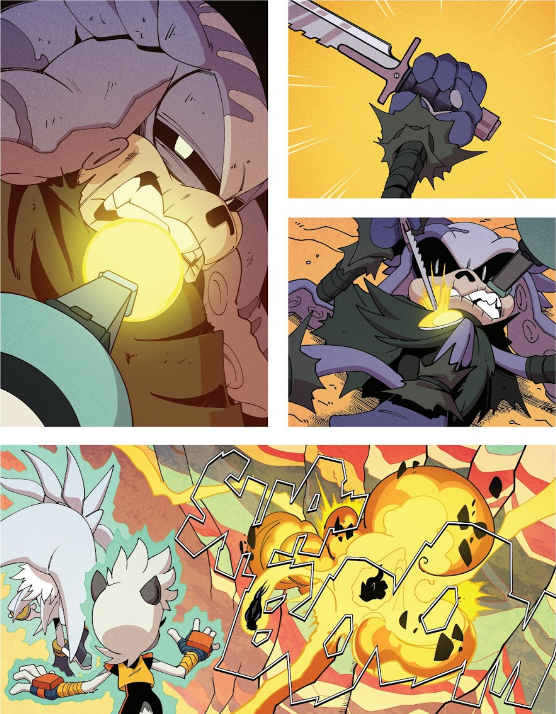 Tangle ambushes the fleeting Mimic by bouncing off the ground and grabbing him with her tail. Whisper activates her Orange Rocket Wisp to pursue. Tangle and Mimic crash land into the earth. She cuts off any attempt for Mimic to speak by pummeling him, denying his ability to do so because she hurt his friends. Mimic shapeshifts into an orange Yeti and roars in refusal to go out like this. Silver catches a tripping Tangle from falling off the cliffside. Whisper activates the Blue Cube mode on her Wispon and bashes Mimic's face in before shifting to Cyan Laser and raining lasers down onto him. Mimic is forced to transform back into his original self. The wolf points her weapon at Mimic, Tangle pleading for Silver to let her go. He does not, saying she will fall if he does.