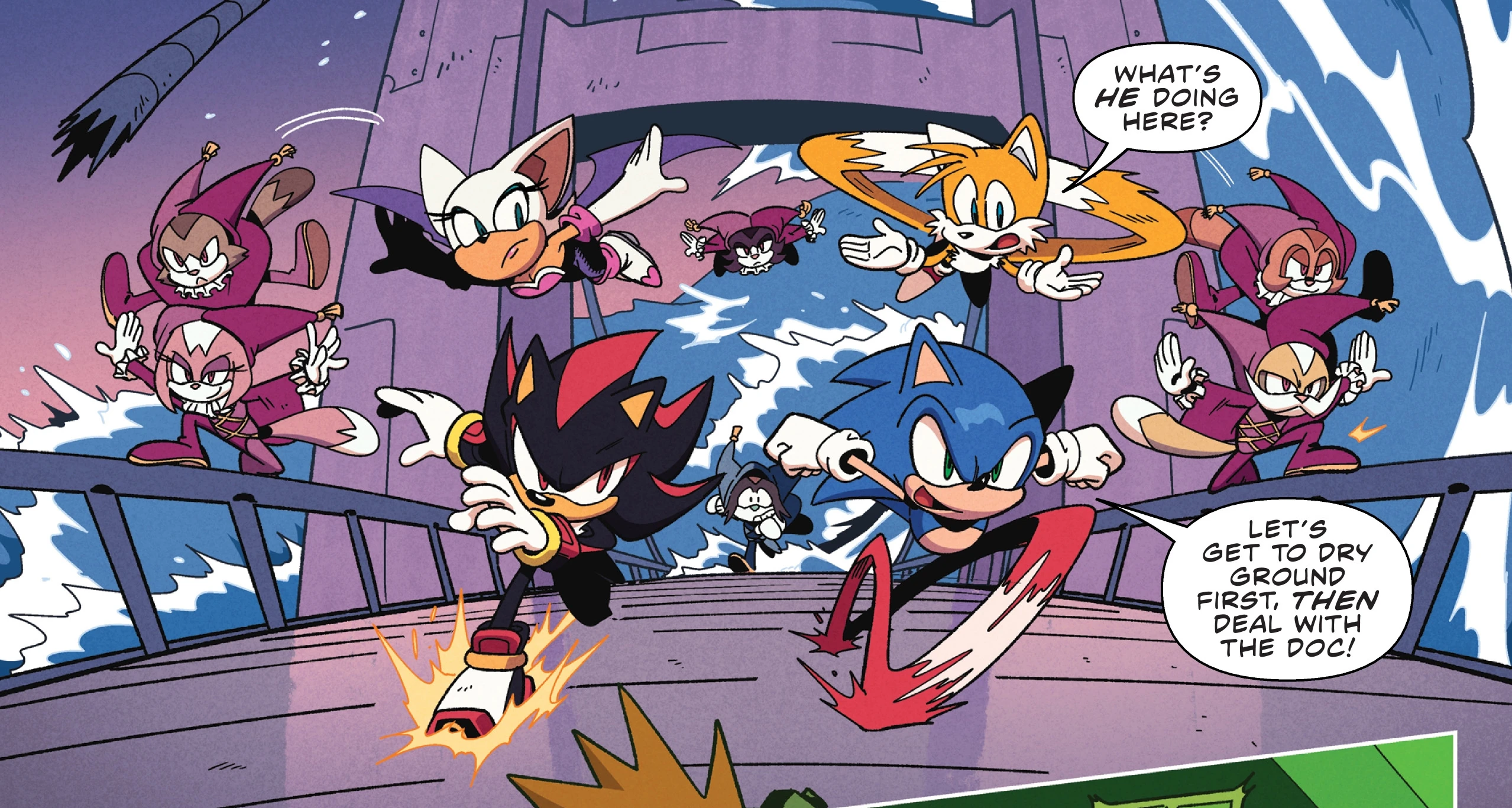 Sonic then asks Shadow to destroy the Badniks before they reach the city. Suddenly a Bell hits Rouge causing her to fall but is caught by Shadow to Rouge's surprise to Shadow saving her, but he responds saying it's the perfect opportunity to use Chaos Control but is interrupted after being hit by Eggman causing Eggman to get the emerald and use it to power his robot. Eggman then hits all the heroes and saying how the power is at 110% percent while generating chainsaws. Tails says how he needs a break with Soleil asking what they are going to do when Sonic annoyingly tells Shadow and Rouge nice going to giving Eggman the emerald. Soon Shadow and Sonic run off with Shadow saying he will claim the emerald form its smoking wreckage. Sonic tells Eggman that chainsaws won't hold them back with Eggman annoying telling them to hold still when Eggman suddenly launches missiles and Sonic and Shadow deflect them back to the robot. Suddenly Eggman hits a nearby building with citizens on it who are falling but are saved by Apogee, Prgee and Yaw, Pitch and Roll who Perigee tells them to continue their fight while they keep the citizens safe and Sonic thanks them. Eggman catches them off guard and hits them with electricity form his chainsaws when Eggman power begins to deplete which was caused by Rouge who used one of the Bell Badniks as a router while Tails used his Miles Electric to short out his energy circuits.
